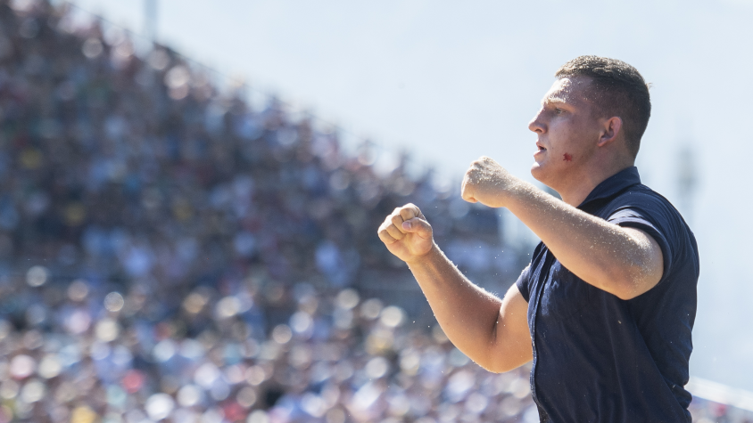 Der Freiburger Lario Kramer holt sich beim Stoos-Schwinget eienen Kranz. Der Sieg geht an Joel Wicki.