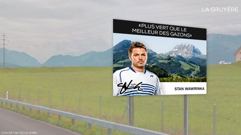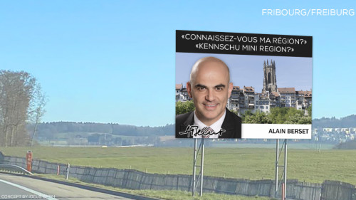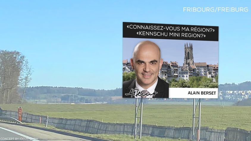„Roger Federer hat einen Vertrag mit Schweiz Tourismus unterzeichnet“, sagt Pierre-Alain Morard, Direktor des Freiburger Tourismusverbands. „In diesem Sinne wollen auch wir bekannte Persönlichkeiten auf Freiburger Autobahntafeln zeigen.“ Morard freut sich über das neue Sujet, welches demnächst auf den 18 Tourismustafeln der Freiburger Autobahnen zu sehen sein wird. „Diese Autobahntafeln sind alt und wir müssen sie ersetzen.“