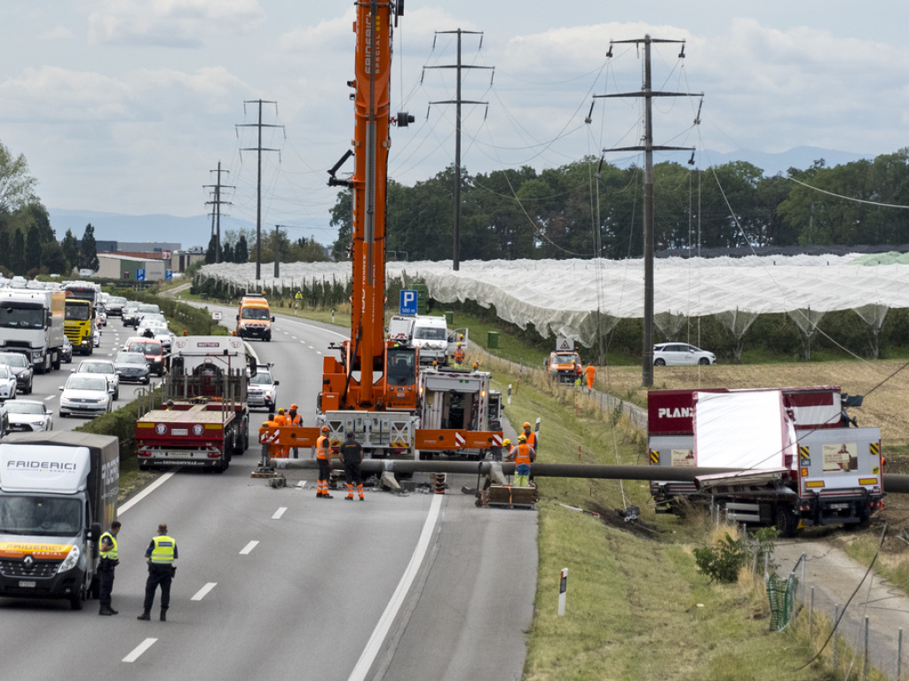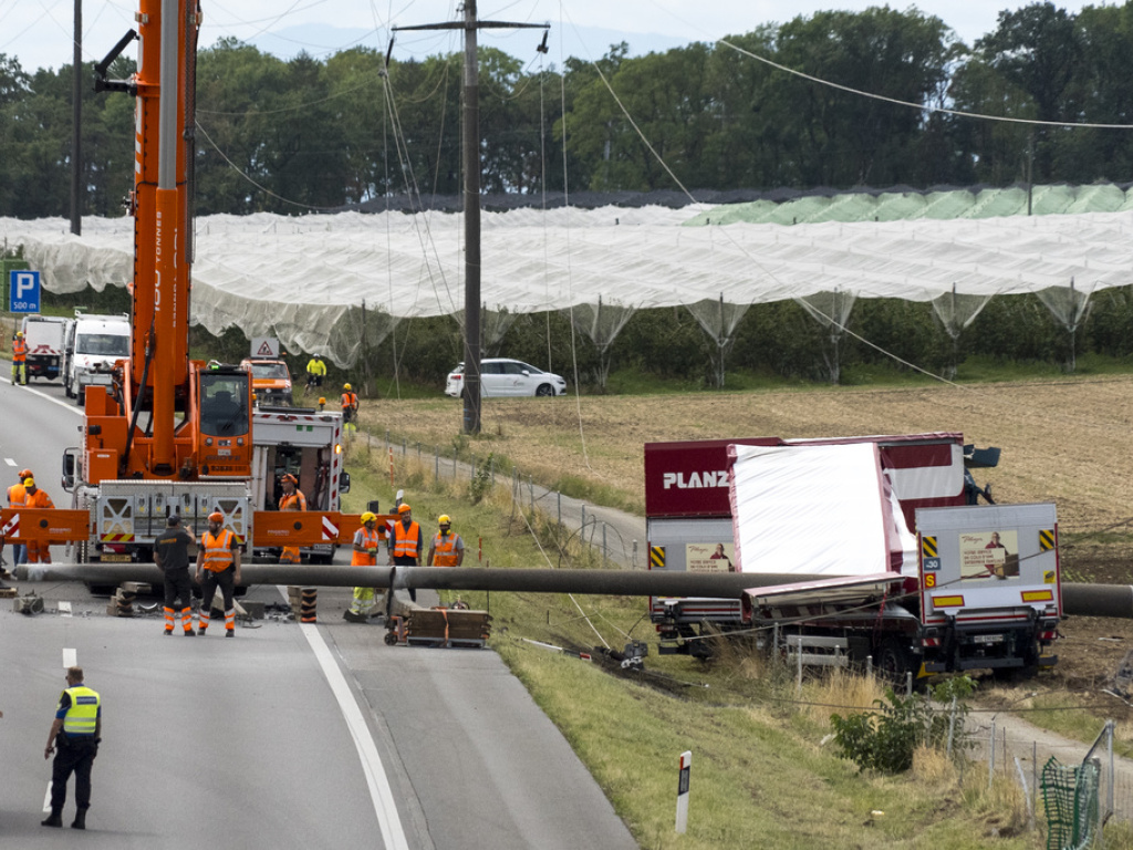 Ein Kran war vor Ort, um den Strommast zu entfernen, der den Pannenstreifen und praktisch beide Fahrspuren der Autobahn in Richtung Genf blockierte. Der Lastwagen und der Anhänger kamen auf einem an die Autobahn grenzenden Weg und einem Agrarfeld zum Stillstand.