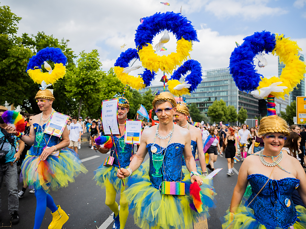 Beim Demonstrationszug machten laut Veranstalter 96 Fahrzeuge und mindestens 80 Fussgruppen aus aller Welt mit - so viele wie noch nie beim CSD in Berlin, der seine 44. Auflage erlebte. Darunter waren auch Menschen aus der Ukraine, die sich seit fünf Monaten eines russischen Angriffskrieges erwehren muss. Ihnen wurde ein Truck gestellt. "War kills my love", stand auf einem Plakat, das eine junge Frau im Demonstrationszug hochhielt - "Krieg tötet meine Liebe".