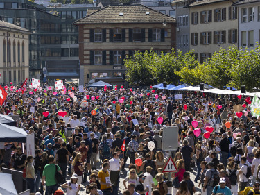 Auffallend präsent ist die Gegnergruppierung „Massvoll“, wie ein Korrespondent der Nachrichtenagentur Keystone-SDA berichtet. Ansonsten sind viele Schweizerfahnen zu sehen. Mit Applaus und Jubel empfingen die Teilnehmenden die etwas verspätet ankommenden „Freiheitstrychler“.