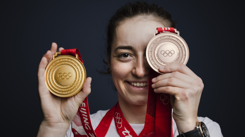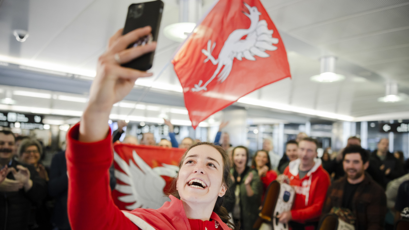 Die Glocken der Greyerzer durften natürlich nicht fehlen. Als die zweifache Medaillengewinnerin von Peking in Zürich ankam, hallten sie lange nach. Mathilde Gremaud ist am Freitagmorgen nach einem langen Flug aus China in Zürich angekommen.