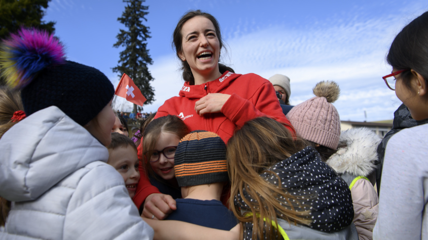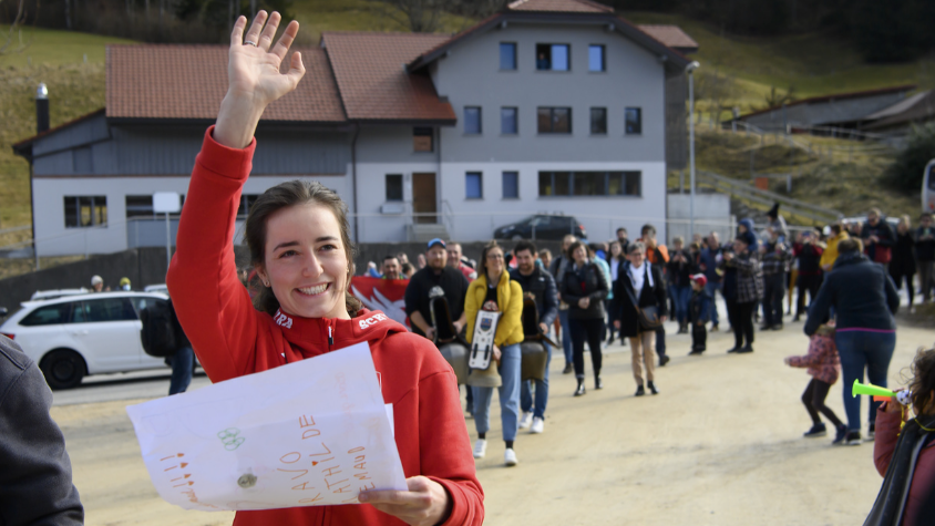Etwa 60 Personen waren mit dem Bus aus La Roche angereist. Um 05.00 Uhr morgens fuhren ihre Familie, ihre Freunde, Mitglieder des Skiclubs, aber auch Lokalpolitiker los, um der 22-Jährigen zu gratulieren. Auch der Staatsrat Didier Castella war vor Ort dabei.