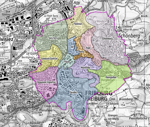 Zum Stadtteil Plätze gehört beispielsweise der Bahnhof Freiburg und der Python-Platz dazu. Es schliesst sich den Stadtteilen Alt, Au (Auge), Beaumont-Vignettaz, Burg (Bourg), Bürglen (Bourguillon), Guintzet-Gambach, Jura-Torry, Neustadt (Neuveville), Palatinat, Pérolles und Schönberg (Schoenberg) an. Mit dieser teilweisen Neueinteilung wollte die Stadt klare und offizielle Umrisse für die Quartiere schaffen, die innerhalb der Stadtverwaltung einhellig anerkannt und verwendet werden.