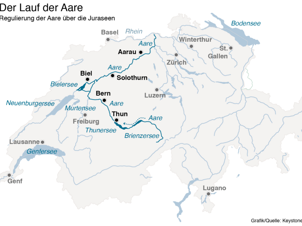 Um die Auswirkungen von Hochwasser möglichst einzudämmen, steuern Bund und Kantone den Abfluss der Aare aus dem Bielersee mit einem Reguliersystem. Kernstück ist das Regulierwehr von Port bei Biel.