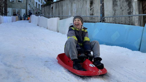 La piste de luge entre le Stalden et la rue de la Samaritaine a attiré ce week-end autant de monde que lors de la dernière édition en 2020, malgré le pass Covid pour les plus de 16 ans. "Les familles sont venues nombreuses", s'est réjoui Stéphane Fellay, membre du Comité d'animation de la place du Petit-Saint-Jean de Fribourg. "Les personnes sans certificat ont pu rester autour et regarder les enfants descendre."