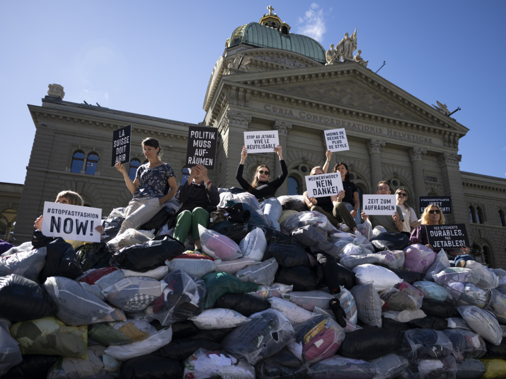 Cinq tonnes d'habits usagés ont été déversées mercredi matin à Berne devant le Palais fédéral. Par cette action symbolique, une coalition de 13 organisations demande au Conseil fédéral et au Parlement des mesures politiques contre la "fast fashion".
