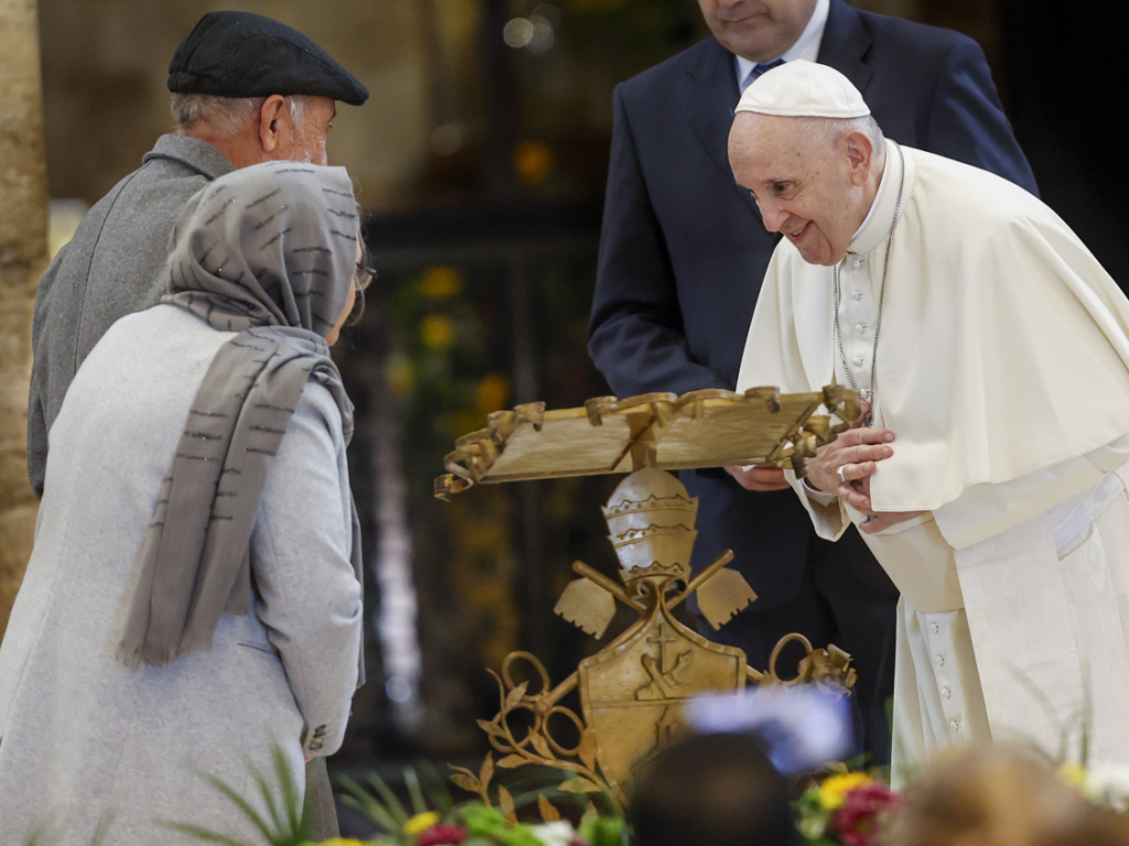 Sous les chants et les applaudissements, le pape de 84 ans s'est vu remettre symboliquement le bâton du pèlerin avant d'entrer dans la basilique Sainte-Marie des Anges. Devant le Portioncule, petite chapelle où est mort Saint François d'Assise en 1226, six personnes, dont deux Afghans, lui ont livré le témoignage de leur parcours difficile, parfois très émues.