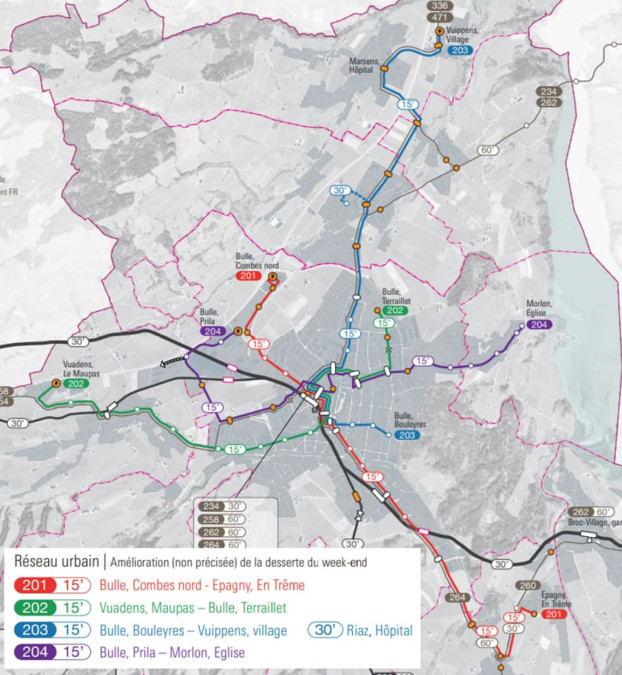 La première phase démarrera en 2027 avec l'électrification de la ligne 202 reliant Vuadens à Morlon. Concrètement, cela nécessitera la création d'une infrastructure de recharge rapide au terminus de Vuadens, l'adaptation de l'équipement du dépôt de Bulle et l'acquisition de cinq bus électriques articulés de type Mercedes-Benz eCitaro. Ces véhicules font partie des 24 commandés par les Transports publics fribourgeois (TPF) début 2025.