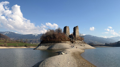 Les Terrasses d'Ogoz… trois immeubles au bord du lac de la Gruyère accueillent 18 logements avec vue sur l'île d'Ogoz. Le lotissement a été livré en 2016 et pourtant, on peut toujours y voir un glissement de terrain en amont de la construction et un important amas de terre en aval.