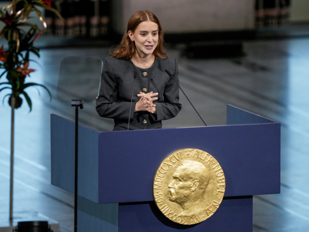 "Pour avoir la démocratie, nous devons être prêts à nous battre pour la liberté", a dit Ana Corina Sosa Machado dans un Hôtel de ville d'Oslo où avaient pris place le président argentin Javier Milei et d'autres chefs d'État latino-américains ayant en commun avec la lauréate des affinités idéologiques avec Donald Trump.