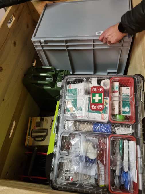 Dans chacun de ces points, on trouve aussi une caisse de matériel de survie qui contient une génératrice, de l'essence, des lampes torches à pile, des civières, une radio DAB et une bouilloire pour se faire des thés ou des soupes en cas de longue attente. Ces points de rencontre d'urgence sont programmés pour tenir 72 heures, ensuite il est prévu que la protection civile prenne le relais.