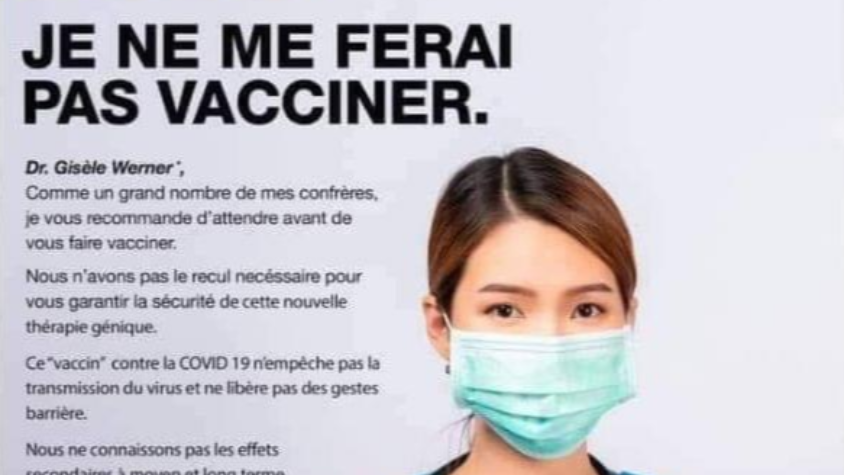 À l'opposé sur l'affiche détournée, on y lit le texte "Je ne me ferai pas vacciner" et un visuel identique qui montre une personne du corps médical portant un masque et le nom fictif de "docteure Gisèle Werner". S'ensuit tout un argumentaire expliquant pourquoi il ne faut pas se faire vacciner contre le coronavirus.