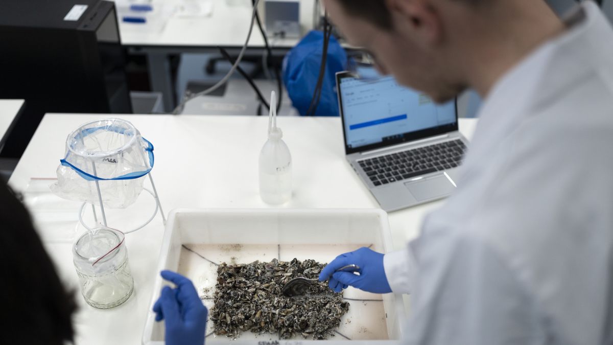 Un collaborateur du laboratoire de recherche sur les moules quagga de l'EAWAG analyse les moules. Cette espèce envahissante est déjà présente dans de nombreux lacs suisses. © KEYSTONE/Gaetan Bally
