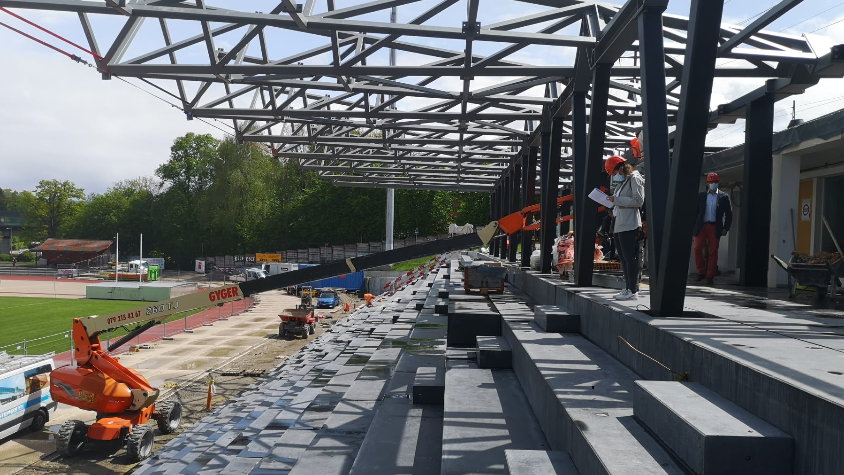 Après plus de 6 mois de travaux, on aperçoit les premiers traits du nouveau visage du site. L'ancienne toiture avait tenu 30 ans avant d'être démontée par précaution en 2019. Il était donc nécessaire de sécuriser le stade avec de nouvelles infrastructures.