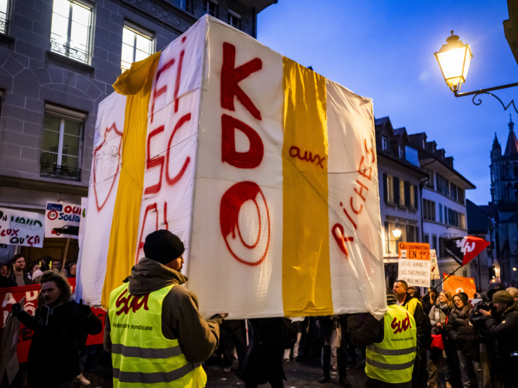 Devant l'entrée du Grand Conseil, les syndicats ont déposé un énorme cube blanc en carton enrubanné sous forme de cadeau, symbolisant le cadeau fiscal du bouclier fiscal pour les très riches. Plusieurs torches ont ensuite été allumées dans les mains des manifestants pour entourer ce cube XXL. Les syndicats avaient invité les participants à rester jusqu'à 22h00.