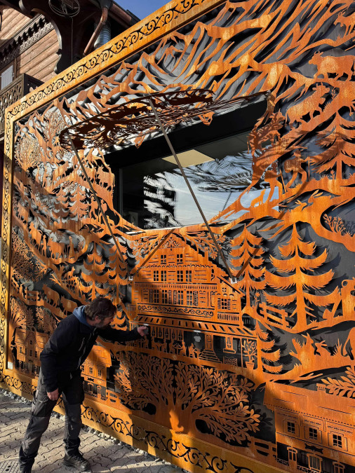 L’illustrateur fribourgeois Thomas Ballé a dessiné deux poyas en acier pour habiller les nouvelles cuisines de l'hôtel. Rencontre.